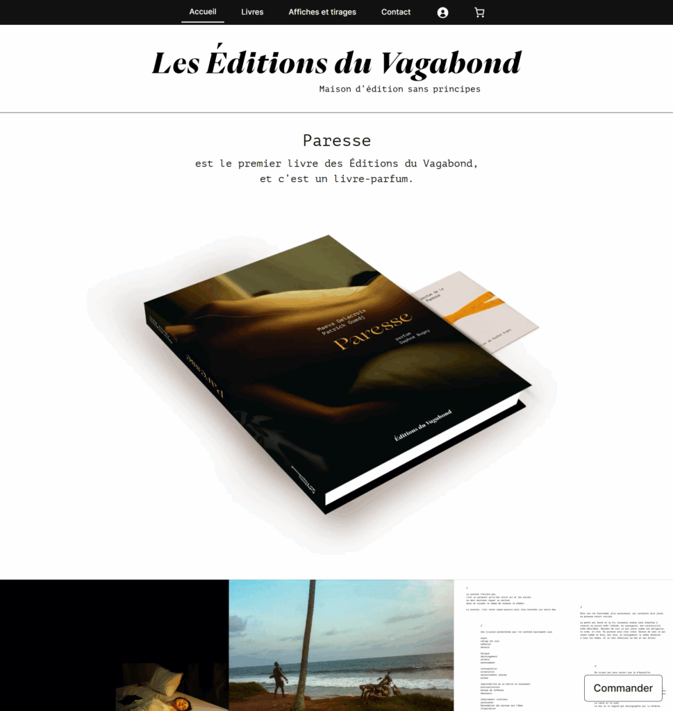 Le site editionsduvagabond.com est maintenant en ligne et fonctionnel. Il permet de vendre les créations livre-parfum avec une interface élégante qui met en valeur le concept unique de la maison d’édition. La boutique est prête à évoluer avec de futures collections et de nouvelles créations.