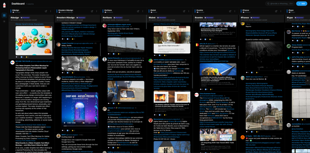Each source gets its own column. You add a Bluesky account here, a Mastodon hashtag there, a Lemmy community alongside — and they all refresh side by side, automatically. The layout is fully yours: drag columns to reorder, set auto-refresh intervals per column, switch between light and dark theme. The interface supports English and French.